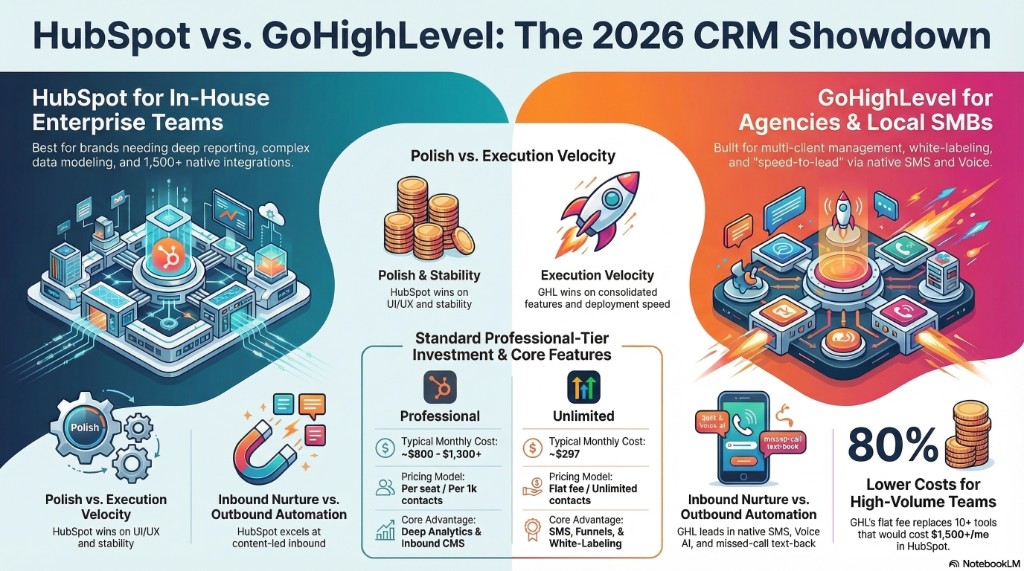 For a 10-client agency, HighLevel often costs 60–80% less than an equivalent HubSpot setup.
